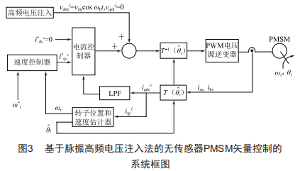 基于脈振高頻電壓注入法的無傳感器PMSM矢量控制的系統(tǒng)框圖如圖3所示 。通過控制g