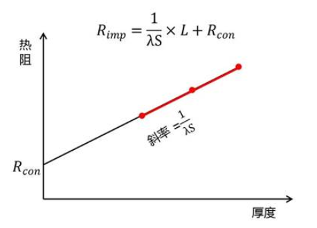 在具體的測(cè)試過(guò)程中,我們可以通過(guò)三點(diǎn)法測(cè)試不同厚度下的界面熱阻,進(jìn)而通過(guò)線性回歸的方法得到L=0時(shí)的熱阻,這個(gè)熱阻即為接觸熱阻R_con,而線性回歸的斜率即為1/λS,由此便得到了材料導(dǎo)熱系數(shù)的具體數(shù)值。