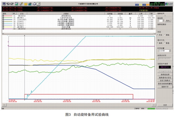 對該電廠其中一臺機(jī)組進(jìn)行自動旋轉(zhuǎn)備用及并泵試驗,自動旋轉(zhuǎn)備用試驗過程:B泵作為主泵,將A泵旋轉(zhuǎn)備用,運(yùn)行人員根據(jù)自動旋轉(zhuǎn)備用條件,手動點(diǎn)擊"自動旋轉(zhuǎn)備用"按鈕,在自動旋轉(zhuǎn)備用過程中給水流量由506t/h變?yōu)?09t/h,總給水量波動小于5%,汽包水位由-7.6mm變?yōu)?.5mm,滿足汽包水位波動在士50mm范圍內(nèi)的要求。自動旋轉(zhuǎn)備用試驗曲線如圖3所示。
