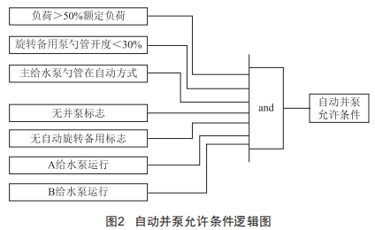 給水泵自動并泵允許條件:機(jī)組實(shí)際負(fù)荷大于50%額定負(fù)荷:A、B電動給水泵均運(yùn)行:旋轉(zhuǎn)備用泵液耦勺管閥位小于30%:主泵勺管在自動狀態(tài):機(jī)組無并泵標(biāo)志:機(jī)組無自動旋轉(zhuǎn)備用標(biāo)志,如圖2所示。