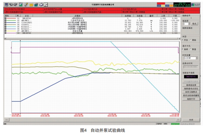 并泵試驗過程:B泵作為主泵,A泵在旋轉(zhuǎn)備用狀態(tài),運(yùn)行人員根據(jù)并泵條件,手動點(diǎn)擊"并泵"按鈕,A泵自動并泵,并泵過程中給水流量由550t/h升至574t/h,總給水量波動小于5%,汽包水位由12.7mm下降至7.3mm,滿足汽包水位波動在±50mm范圍內(nèi)的要求。并泵試驗曲線如圖4所示。
