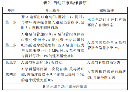 運(yùn)行人員通過畫面手動按下A或B電動給水泵"并泵按鈕",邏輯執(zhí)行自動并泵程序。以A泵為例介紹自動并泵動作步序如表2所示。