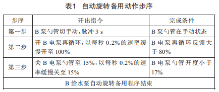 運(yùn)行人員通過畫面手動按下A或B電動給水泵"旋轉(zhuǎn)備用"按鈕,邏輯執(zhí)行自動旋轉(zhuǎn)備用程序。以B泵為例介紹自動旋轉(zhuǎn)備用動作步序如表1所示。