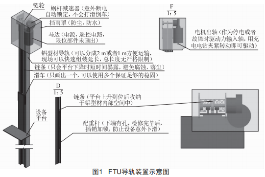 為了方便運檢工作人員更好地完成FTU的巡檢及運維工作,同時免受天氣、空間等外部因素的影響,本項目將研究并制作一種易檢修的FTU導軌裝置。該裝置通過遙控升降的方式實現(xiàn)FTU的自動升降,運維人員無需再進行登高作業(yè)便能在地面對FTU進行相關(guān)操作,滿足電力運檢工作的各項安全標準,具有安全高效、操作方便、穩(wěn)定可靠的特點,能降低運檢人員的勞動負擔,為現(xiàn)場工作的安全便捷開展提供必要的技術(shù)支持。
