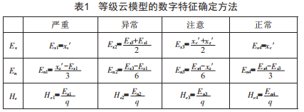 正態(tài)云模型是定性概念和定量表示之間的不確定轉(zhuǎn)換的模型,它將信息的模糊性和隨機(jī)性集成地反映出來,可用(Ex,En,Je)表示。其中,期望Ex代表在一個(gè)空間中最能反映定性概念的值:嫡En是對(duì)概念不確定性的度量:超嫡J(rèn)e即為嫡的嫡,反映云滴的離散程度。