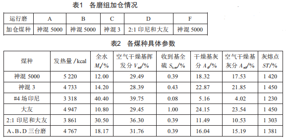 #1機(jī)組負(fù)荷750MW,A、B、C、D、F磨組運(yùn)行,給水量2200t/h,總風(fēng)量2550t/h,總煤量310t/h,#11循泵運(yùn)行,#12循泵備用,中壓分汽缸供熱流量20t/h,高壓分汽缸供熱流量50t/h。各磨組加倉(cāng)情況如表1所示,各煤種具體參數(shù)如表2所示。