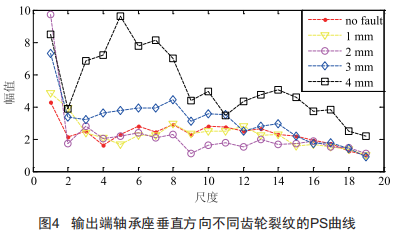 本文采用文獻(xiàn)[4]所述的齒輪裂紋故障實(shí)驗(yàn)臺(tái)實(shí)測(cè)數(shù)據(jù)進(jìn)行有效性驗(yàn)證。選取齒輪無(wú)裂紋和裂紋深度為1mm、2mm、3mm、4mm的振動(dòng)信號(hào)進(jìn)行形態(tài)分析,選取結(jié)構(gòu)元素為扁平型,最大分解尺度為20,計(jì)算數(shù)學(xué)形態(tài)譜并繪制曲線如圖4所示??梢?不同故障程度的數(shù)學(xué)形態(tài)譜曲線形態(tài)不同,具有不同的復(fù)雜度。