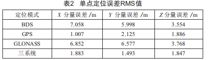為便于定量分析 ,對BDS、GPS、GLONASS、三系統(tǒng)四種模式進行了概率統(tǒng)計 ,求出其均方根RMS值 ,具體如表2所示 ,可明顯看出三系統(tǒng)的定位精度較BDS、GLONASS有顯著提高。