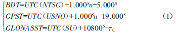 式中 , UrC(NrSC) 、UrC(USN0) 、UrC(SU)分別為中國 、美國和俄羅斯所維持的UrC時:n為國際地球自轉服務發(fā)布的跳秒數(shù):TC為GL0NASSr與UrC(SU)之間存在的lmS以內(nèi)的系統(tǒng)差。