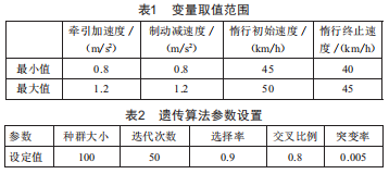 如表1所示,線路限速50km/h,所以惰行初始速度設(shè)置上限為50km/h,同時(shí)為保證取值精度,本文采用實(shí)數(shù)編碼,給定幾個(gè)變量的取值范圍后從中取隨機(jī)值進(jìn)行仿真,并計(jì)算適應(yīng)度函數(shù)。遺傳算法相關(guān)參數(shù)取值設(shè)置如表2所示。