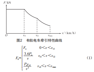 與地鐵相似,有軌電車的牽引力是與速度相關(guān)的函數(shù),分為三段式。啟動(dòng)加速后為恒力牽引,功率不斷上升,此為恒轉(zhuǎn)矩區(qū);到達(dá)額定功率后功率不再上升,牽引力減小,速度繼續(xù)上升,此為恒功率區(qū);在自然特性區(qū),列車的牽引力與運(yùn)行速度的平方成反比關(guān)系,最大功率隨速度增大而減小。牽引特性曲線如圖2所示。