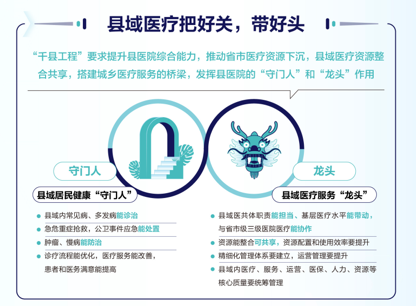 對于縣城居民而言,縣醫(yī)院是保衛(wèi)生命健康的第一道防線,是聯(lián)接城鄉(xiāng)醫(yī)療服務(wù)體系的紐帶。“千縣工程”的一個核心目標,就是推動省市醫(yī)療資源下沉,縣域醫(yī)療資源整合共享,搭建城鄉(xiāng)醫(yī)療服務(wù)的橋梁。