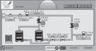 如圖1所示,PLC柜配置一臺(tái)10英寸彩色觸摸屏,實(shí)時(shí)顯示水箱液位、總進(jìn)水管流量、總進(jìn)水管壓力、余氯和濁度數(shù)據(jù),同時(shí)顯示電動(dòng)閥的開啟狀態(tài),實(shí)時(shí)彈出系統(tǒng)故障。