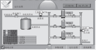 當(dāng)市政總管供水壓力低于設(shè)定值時(shí)自動(dòng)切換至水箱供水,水箱水位至低水位時(shí)泵組停止工作,并將信息傳遞至監(jiān)控中心:進(jìn)水管上兩組壓力傳感器監(jiān)控到供水壓力差超過設(shè)定值時(shí)自動(dòng)關(guān)閉進(jìn)水管電動(dòng)閥,水箱水位超溢流水位時(shí)自動(dòng)關(guān)閉水箱進(jìn)水電動(dòng)閥,并將信息傳遞至監(jiān)控中心。為了保證水箱內(nèi)水質(zhì),系統(tǒng)還設(shè)置了定時(shí)換水功能。水箱內(nèi)的水必須每24h更換一遍,從而保證水箱內(nèi)的水每天都是新鮮的。