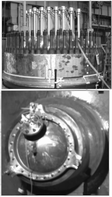 密封接頭引線采用螺栓雙頭鎖緊方式密封,每芯導線依次穿過緊固螺栓、墊片、楔形塊、特制密封墊片,另一端連接水下應變片,密封結(jié)構(gòu)如圖1所示。引線密封包括筒體接管引出線的密封和頂蓋引出線的密封,筒體引線接口設置在筒體密封接管上,頂蓋引線則從CRDM管接口引出。測試組共研制了7套筒體接管密封接頭,每個密封接頭有8根引線引出,如圖2所示:頂蓋位置研制了3套密封接頭,每套密封頭有7根引線引出。所有密封接頭裝置都在增容緩沖罐上加壓測試,23MPa水壓下保壓1h不滲漏。