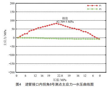 22.8MPa水壓下壓力容器本體部分測點的應變測試結(jié)果如表2所示,并選取計算了進管接口內(nèi)拐角8號測點的主應力參數(shù),如圖4所示(因篇幅有限,其他測試內(nèi)容未詳盡給出)。所有測點測試數(shù)據(jù)結(jié)果表明:壓力容器內(nèi)外測點部位均處于彈性狀態(tài),在壓力容器允許的結(jié)構(gòu)安全范圍內(nèi),實測數(shù)據(jù)表明了應變測試的可靠性。