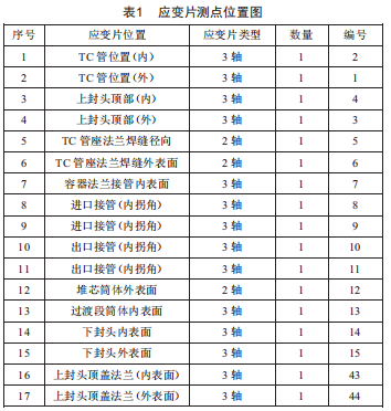 應變片位置、類型、數(shù)量及編號如表1所示。應變片測點布置為考慮水壓試驗時溫度對應變片的影響,在筒體內(nèi)部和外部分別設置了單軸應變片作為溫度補償片。本次測試采用Ts3890型分布式靜態(tài)電阻應變儀,含60個應變測試通道。