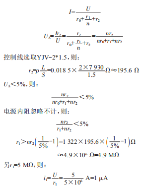 式中,I為控制回路電流:U為主控制器輸出電壓:UA為線路壓降:r0為主控制器控制內(nèi)阻:r1為單燈控制器輸入電阻:r2為線纜電阻:i1為單燈控制器控制電流:L為控制電纜長(zhǎng)度:p為銅電纜電阻率。