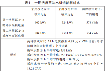 2018年,結(jié)合一期活疫苗車間改造,公司直接為中央空調(diào)的冷水機(jī)組和循環(huán)冷卻水泵做了正反饋聯(lián)鎖裝置(冷卻塔風(fēng)機(jī)進(jìn)行溫控沒有完成)。經(jīng)過將近一年的運(yùn)行,系統(tǒng)比較穩(wěn)定,不僅達(dá)到了節(jié)約用電的目標(biāo),同時也保證了冷水機(jī)組始終在額定最佳工況下運(yùn)行。
