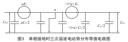 三次諧波電壓的繼電保護是否動作 , 是通過比較中性點三次諧波電壓和機端三次諧波電壓來實現(xiàn)的 ,單相接地時三次諧波電動勢分布等值電路圖如圖3所示 。其中 ,E3為三次諧波電動勢 , Us3為機端三次諧波電壓 , Un3為中性點三次諧波電壓 ,Cf為發(fā)電機對地電容 ,Cw為機端出線及設備對地電容。