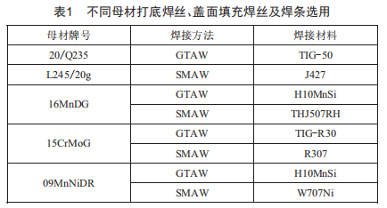 壓力管道結(jié)構(gòu)如圖1所示,管道形狀有三通、彎頭和直縫管。管道材質(zhì)為普通碳鋼(o235、20#等),Cr-Mo型低合金鋼及Mn型、Mn-Ni型低溫鋼。管道規(guī)格:DN500~600、DN200等,厚度6=5~10mm。母材牌號(hào)、焊條牌號(hào)、焊接牌號(hào)及焊接方法如表1所示。涉及焊接結(jié)構(gòu)為管與管對(duì)接,法蘭與管道對(duì)接。采用氬一電聯(lián)焊的焊接工藝:氬弧焊(GTAW)焊絲打底焊,手工電弧焊(sMAW)焊條填充焊。