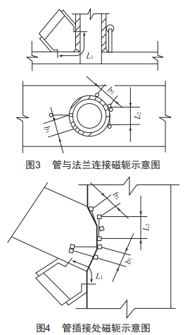 (1)磁輒法:每次磁化只可以單向磁化而且檢測(cè)面積小。法蘭位置類似板材采用該方法磁化??蓹z測(cè)管與法蘭連接處,如圖3所示,也可檢測(cè)管插接處,如圖4所示。