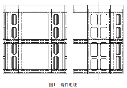 主體框架是某型號導(dǎo)彈的一個重要結(jié)構(gòu)件,材料為ZM5,熱處理狀態(tài)為T4,鑄件類型為Ⅱ類,技術(shù)標(biāo)準(zhǔn)為HB964和HB965。鑄件為框架結(jié)構(gòu),由水平位置的三塊八邊形結(jié)構(gòu)的板和四塊側(cè)立板將其連接,水平的三塊板中,上下兩塊板中心有一較大的穿孔,中間幅板將上下分開為兩個獨立部分,四塊側(cè)立板上開有窗口。零件由鑄件毛坯(圖1)全部機加工而成,鑄件毛坯要求全部進行x光和熒光無損探傷檢查。