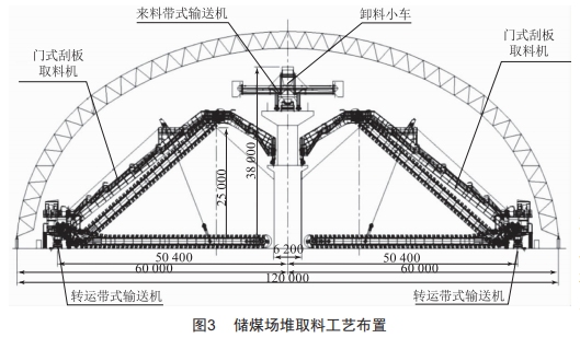 根據(jù)來料量2800t/h和工程實(shí)際情況選擇本工程堆取工藝設(shè)備參數(shù)。由于目前門式刮板取料機(jī)取料能力最大約為1500t/h,因此選取兩臺門式刮板取料機(jī)和兩部轉(zhuǎn)運(yùn)帶式輸送機(jī)。堆取料工藝如圖3所示。