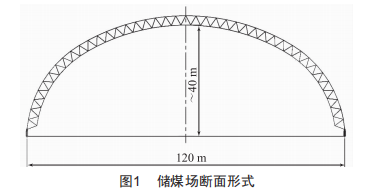 某礦需建設(shè)一座封閉式矩形儲煤場,長160m,寬120m,采用半圓拱形鋼結(jié)構(gòu)網(wǎng)架+彩鋼板的封閉方式,斷面如圖1所示。