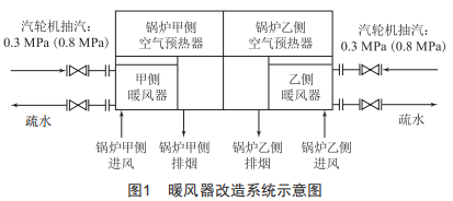 鍋爐暖風(fēng)器是利用汽輪機(jī)低壓抽汽加熱空氣預(yù)熱器進(jìn)口空氣的熱交換器。鍋爐暖風(fēng)器安裝在送風(fēng)機(jī)出口與空氣預(yù)熱器入口之間,故又稱前置式空氣預(yù)熱器。加裝暖風(fēng)器,可使進(jìn)入空氣預(yù)熱器的空氣溫度升高,空氣預(yù)熱器壁溫升高,提高空預(yù)器的冷段綜合溫度,從而防止低溫腐蝕和硫酸氫銨板結(jié)。暖風(fēng)機(jī)改造系統(tǒng)示意圖如圖1所示。