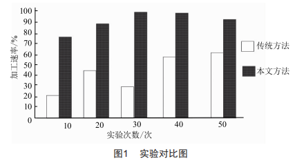 上述分析只是從理論上證明了此次設(shè)計的有效性,為了證明此次設(shè)計的方法具有一定的實際應(yīng)用意義,下面進行實驗論證。同時,為了保證實驗的嚴謹性,將傳統(tǒng)方法與本文設(shè)計的激光切割加工工藝優(yōu)化方法進行對比,主要對比兩種加工方法的加工時間,實驗對比結(jié)果如圖1所示。