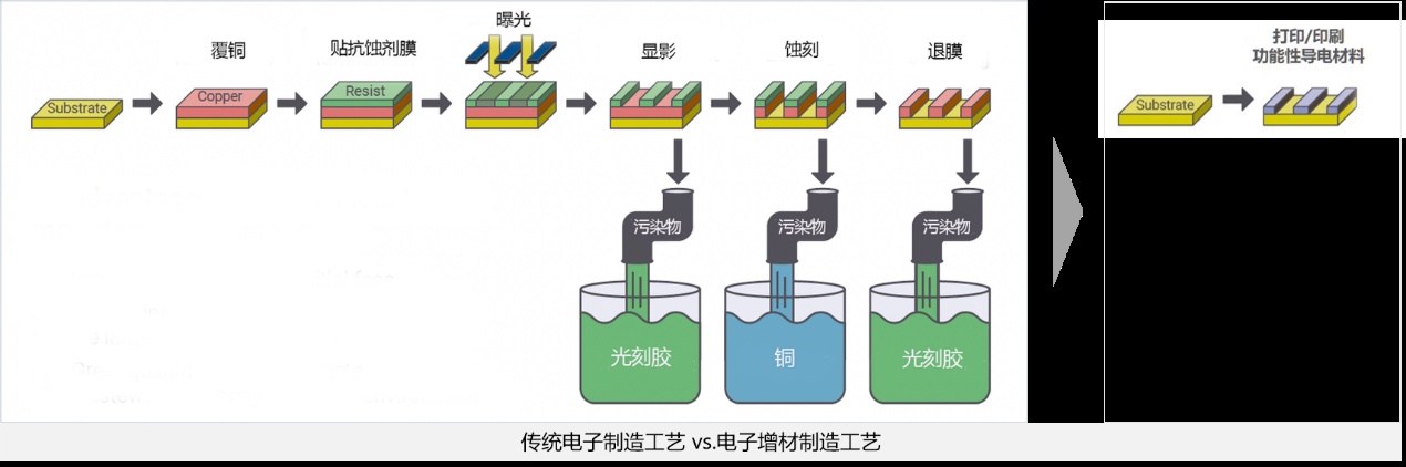 相比于傳統(tǒng)的電子制造模式,電子增材制造工藝制程大幅簡(jiǎn)化、生產(chǎn)過程無廢水廢料排放過程,使用的導(dǎo)電材料如液態(tài)金屬無毒無害,可完全滿足工業(yè)生產(chǎn)低能耗、低排放標(biāo)準(zhǔn),滿足未來長(zhǎng)遠(yuǎn)發(fā)展要求。