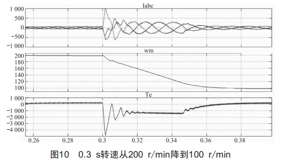 0.3s轉(zhuǎn)速從200r/min降到100r/min,波形如圖10所示。