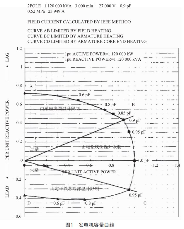 發(fā)電機容量曲線(圖1)上的橫坐標為有功功率,縱坐標為無功功率,例如,功率圓第6點有功功率取1065(橫坐標在0.95pF位置),從曲線圖上就可以查出該負荷下對應的無功功率上限值492(縱坐標在0.439pF位置)。