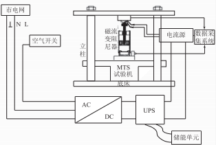 完成電路設(shè)計(jì)后 ,利用Protue.完成原理圖設(shè)計(jì)和PCB板布線并制作系統(tǒng)電路硬件 。實(shí)驗(yàn)采用MTS型電液伺服拉力試驗(yàn)機(jī)配合力傳感器和數(shù)據(jù)采集系統(tǒng)檢測磁流變阻尼器力學(xué)性能變化情況 ,通過霍爾電流傳感器測量儲(chǔ)能單元斷電切換瞬間的輸出電流上升速度。實(shí)驗(yàn)臺(tái)如圖2所示。主電源端接額定S2 V/6 A開關(guān)電源,開關(guān)電源輸入端通過空氣開關(guān)接單相220 V 交流市電 ,選用儲(chǔ)能單元為S2 V/500 F超級電容模組。