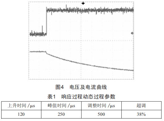 由表1數(shù)據(jù)可知 ,雖然超級電容輸出電流超調(diào)較大 ,但是能夠在150 μ.內(nèi)迅速達(dá)到穩(wěn)定值。從上述分析可知 ,在對于電源響應(yīng)性能要求高的場合 , 以超級電容器作為儲(chǔ)能單元能夠提高系統(tǒng)的電流響應(yīng)速度 ,縮短系統(tǒng)達(dá)到穩(wěn)定的時(shí)間。
