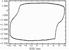 MR阻尼器通過夾具固定在MTS拉力試驗(yàn)機(jī)上 ,調(diào)節(jié)電流驅(qū)動(dòng)器以1 A電流供電 ,在試驗(yàn)機(jī)上位機(jī)軟件界面上設(shè)定頻率0.5Hz、振幅10 mm運(yùn)行 , 阻尼器通過振幅零點(diǎn)時(shí)斷開空氣開關(guān) ,得到MR阻尼器阻尼力-振幅曲線如圖3所示 。通過雙通道示波器分別采集主電源端電壓和霍爾電流傳感器輸出波形曲線如圖4所示。
