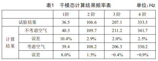 干模態(tài)計算結(jié)果如表1所示。不考慮空氣耦合時,1階彎曲頻率計算誤差較大,達(dá)10.4%,2~4階相對稍小,偏差在2%~3%??紤]空氣耦合的計算頻率有所下降,1階較實(shí)測值偏大8.0%,其余3階偏差在-0.4%~1.5%。