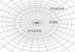 通過建立流固耦合數(shù)學(xué)模型,將流場和結(jié)構(gòu)有限元離散化求解。動力學(xué)方程符合邊界相容條件。三維模型管外流體域直徑為管直徑的8倍,采用線性勢流體六面體結(jié)構(gòu)化單元,結(jié)構(gòu)域網(wǎng)格為4層,各流體域近壁面網(wǎng)格與結(jié)構(gòu)域尺寸相當(dāng),截面圖如圖1所示。各域邊界接觸協(xié)同。流體域介質(zhì)為空氣或水,選取20℃下標(biāo)準(zhǔn)參數(shù),空氣密度β=1.205kg/m3,體積模量K=10.1kPa:水密度β=998kg/m3,體積模量K=2560MPa。