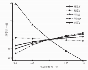 相對基準(zhǔn)工況,將變動參數(shù)和計算頻率結(jié)果各自歸一化,有利于分析參數(shù)影響程度,結(jié)果如圖4所示。彈性管長度影響程度最大,對應(yīng)頻率在0.45~3.97倍間變化。其余參數(shù)影響相對較小,均在0.59~1.28倍之間。影響程度按長度、外徑、模量、壁厚和密度依次減小。其中長度和密度與頻率呈反向變動關(guān)系,其他呈正向變動關(guān)系。將濕/干模態(tài)頻率之比作為影響系數(shù),可進(jìn)一步分析流固耦合隨參數(shù)變化的作用程度,由于篇幅有限本文不再展開。