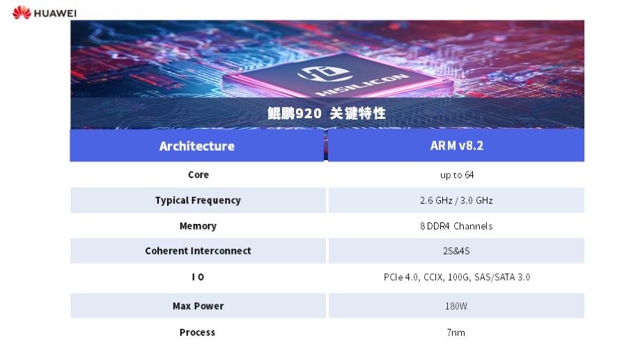 鯤鵬920是華為自研的一顆基于ARM架構(gòu)的7nm工藝的數(shù)據(jù)中心處理器,具有高性能、高吞吐、高集成、高能效等特性。鯤鵬920主頻可達(dá) 2.6GHz,單芯片可支持64核。該芯片集成8通道DDR4,內(nèi)存帶寬超出業(yè)界主流46%。芯片集成100G RoCE以太網(wǎng)卡功能,大幅提高系統(tǒng)集成度。鯤鵬 920支持PCIe4.0及CCIX接口,可提供640Gbps總帶寬,單槽位接口速率為業(yè)界主流速率的兩倍,有效提升存儲(chǔ)及各類(lèi)加速器的性能。典型主頻下,SPECint Benchmark 評(píng)分超過(guò)930,超出業(yè)界標(biāo)桿25%。同時(shí),能效比優(yōu)于業(yè)界標(biāo)桿30%。鯤鵬920以更低功耗為數(shù)據(jù)中心提供更強(qiáng)性能。