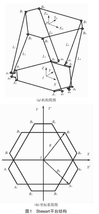并聯(lián)六自由度stewart平臺(tái)運(yùn)動(dòng)系統(tǒng)結(jié)構(gòu)簡(jiǎn)圖如圖1所示。首先建立坐標(biāo)系,1-XyZ為慣性坐標(biāo)系,原點(diǎn)是下平臺(tái)較接點(diǎn)形成的六角形幾何中心。P-XMyMZM為上平臺(tái)坐標(biāo)系,原點(diǎn)為上平臺(tái)質(zhì)心。在動(dòng)坐標(biāo)系中的R'可以通過(guò)坐標(biāo)變換的方式得到慣性坐標(biāo)系中的R: