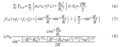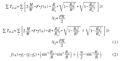 為了更精確地模擬纖維紗片在高緯度球殼處的重疊,避免纖維重疊造成的抗力浪費(fèi),在公式(1)中創(chuàng)新性地引入"通用雙公式"模型模擬球殼上各點(diǎn)的纖維厚度1x,同時(shí)以纖維/樹脂單層板抗拉強(qiáng)度ab替換公式(1)中的單束纖維抗力F,從而更真實(shí)地還原纖維層的強(qiáng)度特性。整理得到的新理論公式如下: