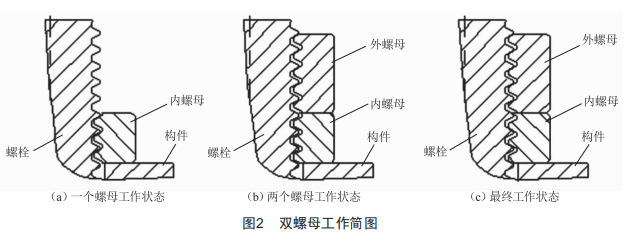 當(dāng)擰上并逐步擰緊第二個(gè)螺母(即雙螺母的外螺母),外螺母螺紋的上部與螺栓螺紋的下部接觸并有相互頂力F2存在,而這時(shí),外螺母對(duì)內(nèi)螺母同樣存在相互頂力F2,頂力F2使內(nèi)螺母螺紋的上部與螺栓螺紋的下部接觸頂力降低為F1-F2:隨著外螺母的繼續(xù)擰緊,外螺母與螺栓相互頂力F2增大,當(dāng)F2=F1時(shí),內(nèi)螺母螺紋的上部與螺栓螺紋的下部接觸頂力為零:當(dāng)F2>F1時(shí),內(nèi)螺母螺紋與螺栓螺紋將不會(huì)接觸,如圖2(b)所示。