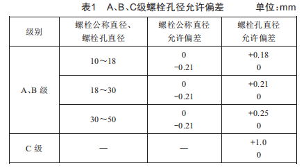 文獻(xiàn)[1]中規(guī)定A、B級(jí)螺栓孔應(yīng)具有H12的精度,A、B、C級(jí)螺栓孔徑允許偏差要求如表1所示。
