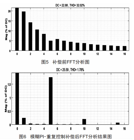 圖4中曲線+為未補償前輸出電流的波形,曲線1為補償后輸出電流的波形。圖5為補償前輸出電流的FFT分析圖,諧波畸變率達(dá)到21.01%。圖6為直流有源濾波器補償后輸出電流的FFT分析圖,THD值為+.78%。通過對比分析可知,基于模糊PI-重復(fù)控制的直流有源濾波器具有較好的濾波效果。