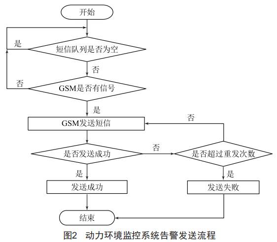 動力環(huán)境監(jiān)控系統(tǒng)的告警需要傳送到值班人員手機,這就需要在動力環(huán)境監(jiān)控系統(tǒng)上安裝短信告警模塊。傳感器數(shù)據(jù)初始化,判斷短信隊列是否為空,如果短信隊列為空,就重新開始。假如隊列不為空,就判斷GsM是否有信號,如果有信號,即進(jìn)行告警信息的發(fā)送,如果沒信號,則中斷發(fā)送。短信發(fā)送失敗后,重新發(fā)送此信息,重發(fā)短信不會將短信放回短信隊列中,而是立即按照設(shè)定的重發(fā)次數(shù)發(fā)送短信,發(fā)送結(jié)果為最后一次重試的結(jié)果。流程如圖2所示。