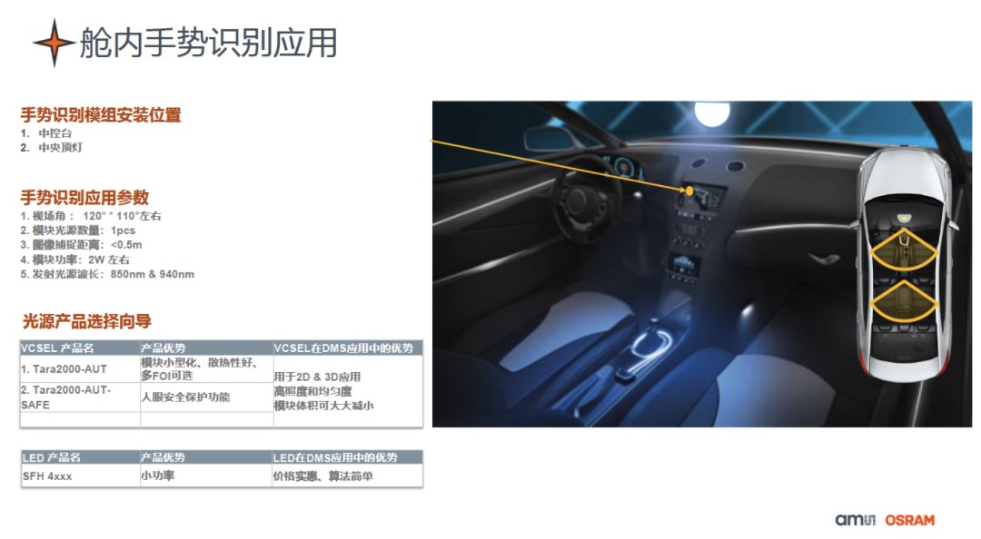 在汽車智能座艙中,目前行業(yè)內(nèi)包含三大具體的應用系統(tǒng),分別是駕駛員狀態(tài)監(jiān)測系統(tǒng)(DMS)、手勢識別系統(tǒng)和車艙內(nèi)監(jiān)控系統(tǒng)(IMS)。這三大系統(tǒng)中同樣少不了光源電子器件的參與,ams OSRAM也提供了此三類應用中的光源部分,助力實現(xiàn)更安全的狀態(tài)和環(huán)境監(jiān)測、更便捷的ID自動識別、更高效的手勢操作和更舒適的自動控制。
