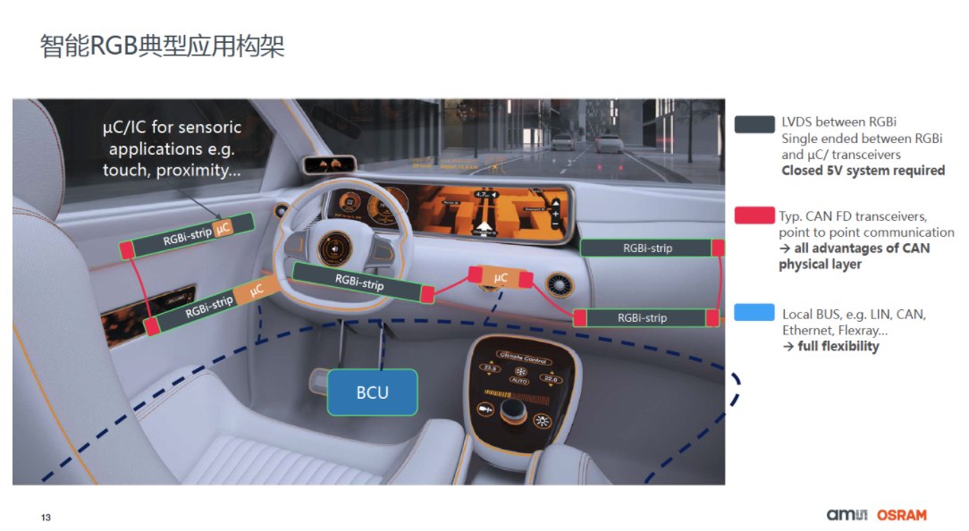 在汽車的實際應用中,RGB的數(shù)量可能非常多,而且遍布在車身的不同位置。傳統(tǒng)RGB方案的痛點在于,每顆RGB可能都需要單獨的驅(qū)動、單獨的校驗,PCB的設計復雜度會提高,校驗帶來的工時也會增常。而使用RGBi的方案,可以將在線校驗的步驟省略掉,而且RGB和RGB之間通過LVDS傳輸,延時也可以得到很好的控制。PCB板的設計也可以得到極大程度的簡化,甚至可以使用一些FPC來實現(xiàn)一些2.5D造型。