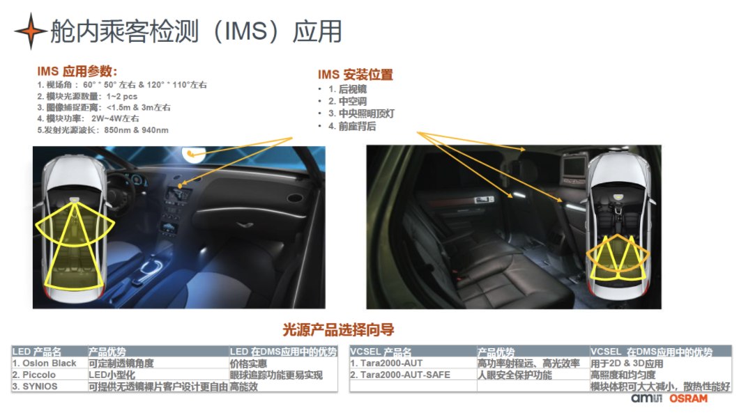 IMS艙內(nèi)乘客檢測的大部分應用趨向于用大于100度的角度去進行艙內(nèi)全局的補光,安裝的位置是基于中間向全車布局的方式,所以不能直接覆蓋DMS的光源需求。相比DMS,IMS更趨向于監(jiān)測全車乘客狀態(tài)的功能,主流的同樣是采用2D的方式。